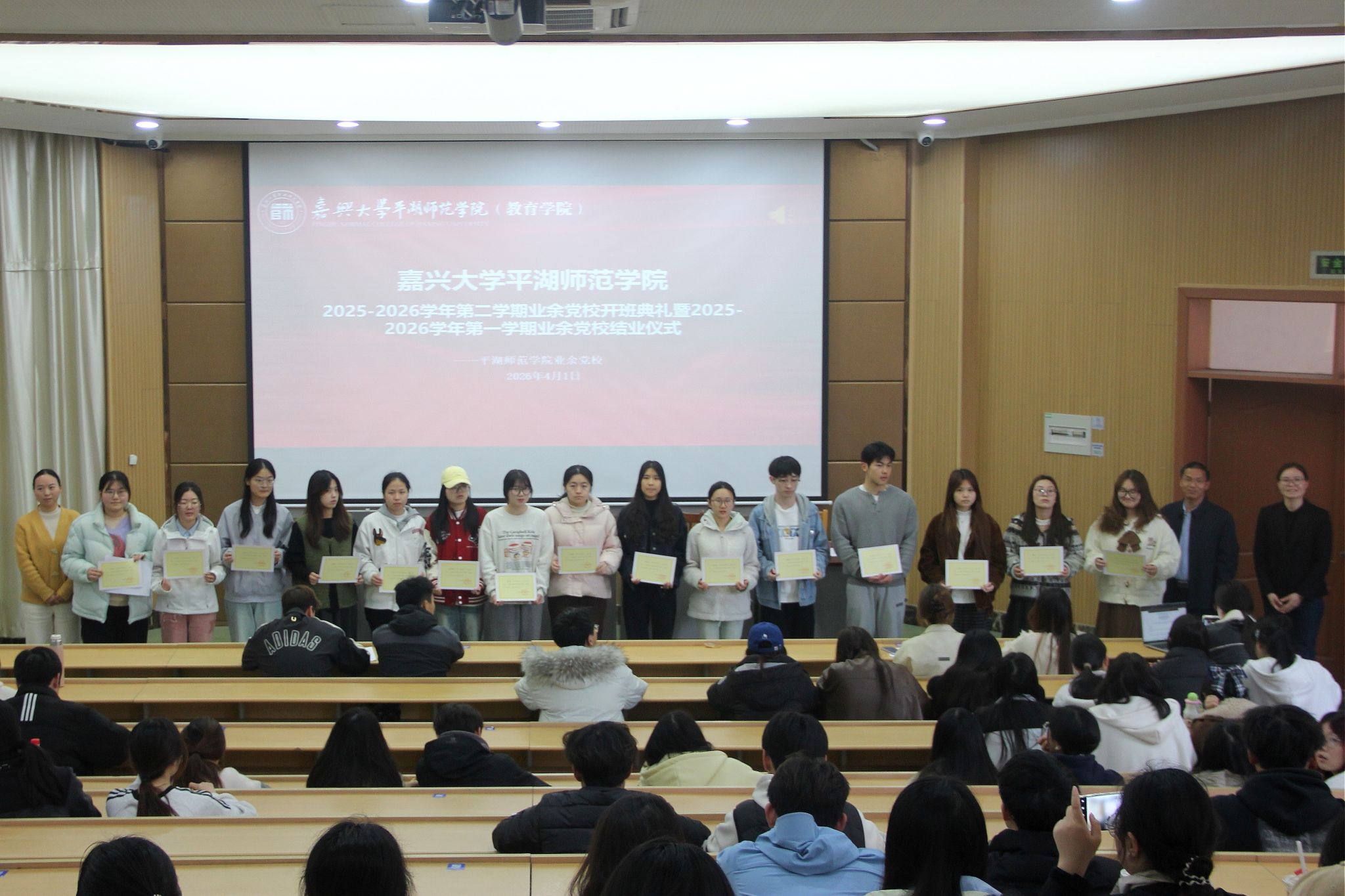 4月1日,学院2025—2026学年第二学期业余党校开学典礼暨上一期结业仪式在阶梯教室三举行。学院党委书记冯伟芳、党委副书记卓海丹,党校班主任张田田及228名党校学员参加仪式。