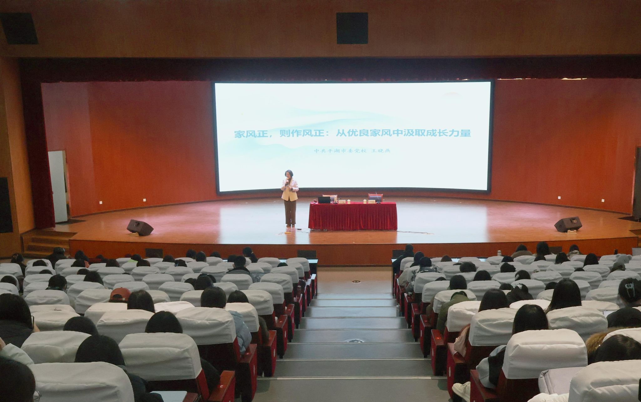 12月18日,学院特邀中共平湖市委党校校委委员王晓燕主讲“家风正则作风正:从优良家风中汲取成长力量”主题讲座,学院党委副书记、纪委书记卓海丹主持,四百余名学生到场聆听。