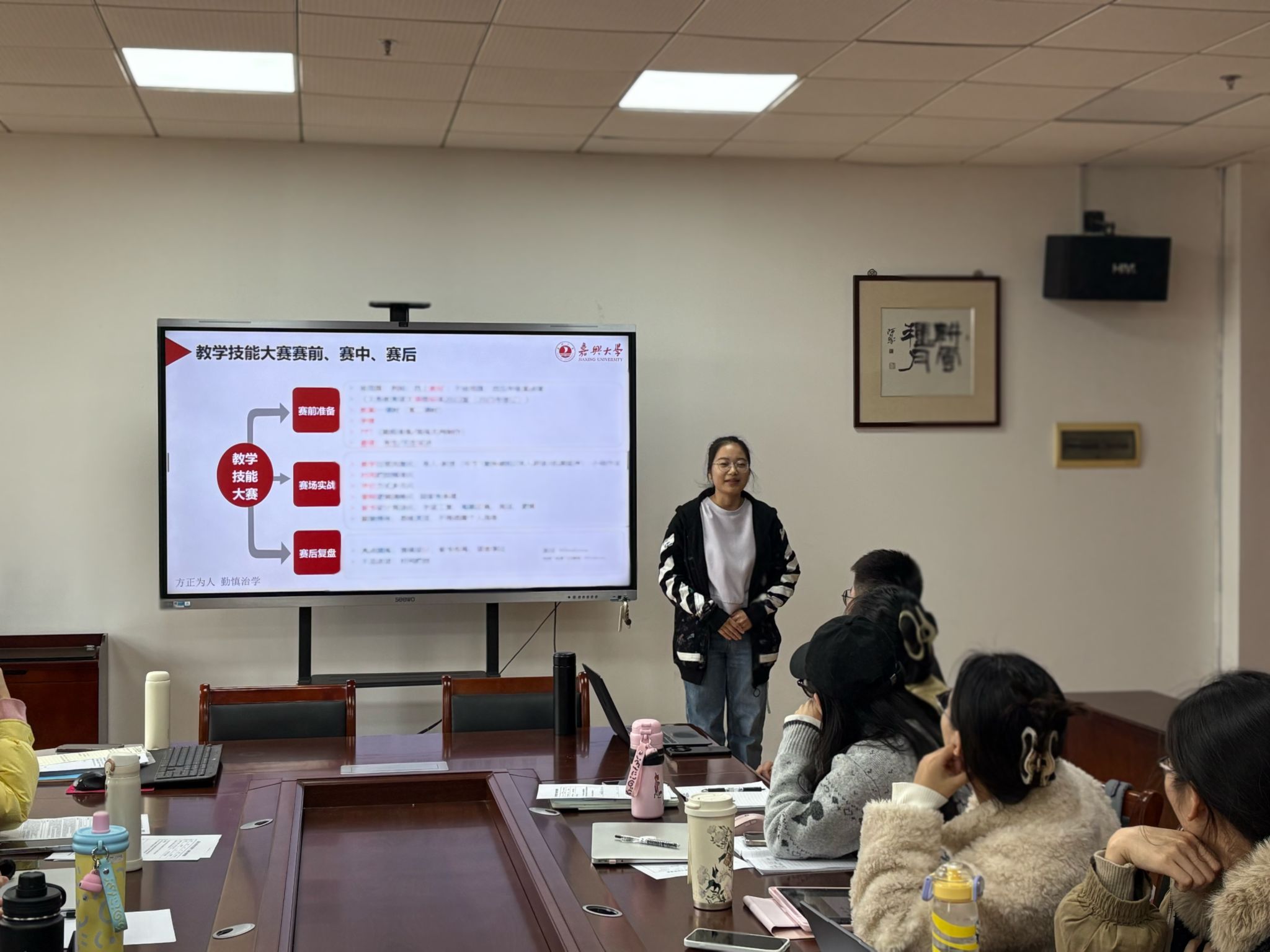 12月10日上午,学院成功组织研究生教学技能大赛分享会,由陆浩老师主持,曾获辽宁省高校师范生教学技能创新大赛一等奖的焦苏萌同学分享。本次分享聚焦教学技能大赛全流程备赛技巧,旨在为教育硕士研究生搭建学习交流平台,助力其实践能力的提升。
