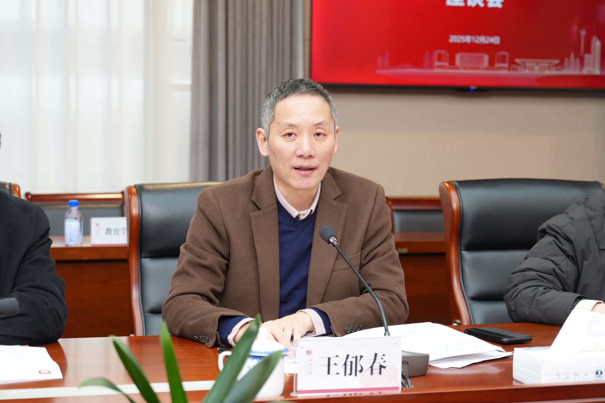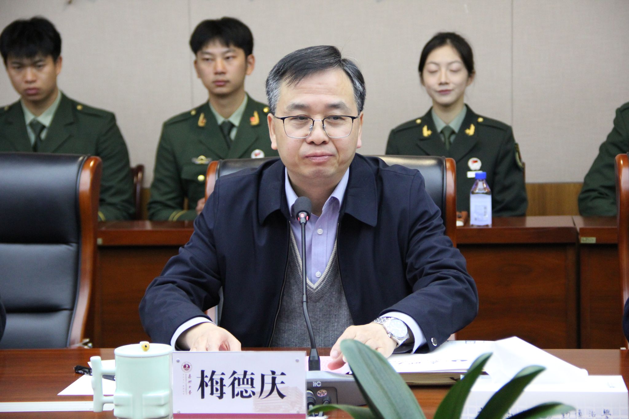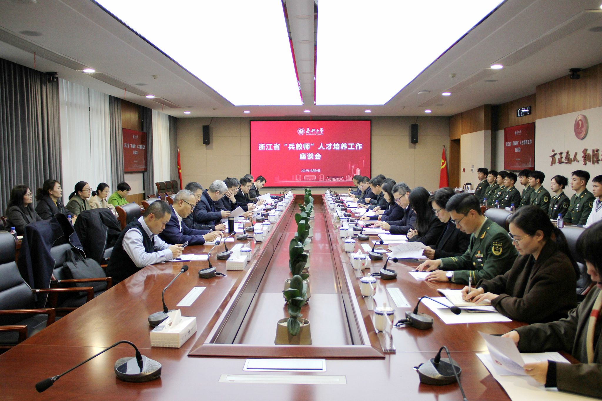 12月24日,浙江省“兵教师”人才培养工作座谈会在梁林校区行政楼346会议室召开。省退役军人事务厅党组成员、副厅长胡永光,省教育厅党组成员、副厅长舒培冬,校长梅德庆出席会议。校党委副书记陈立力主持会议。省市退役军人事务部门和教育部门的相关负责人,优秀“兵教师”代表,学院相关师生参加会议。