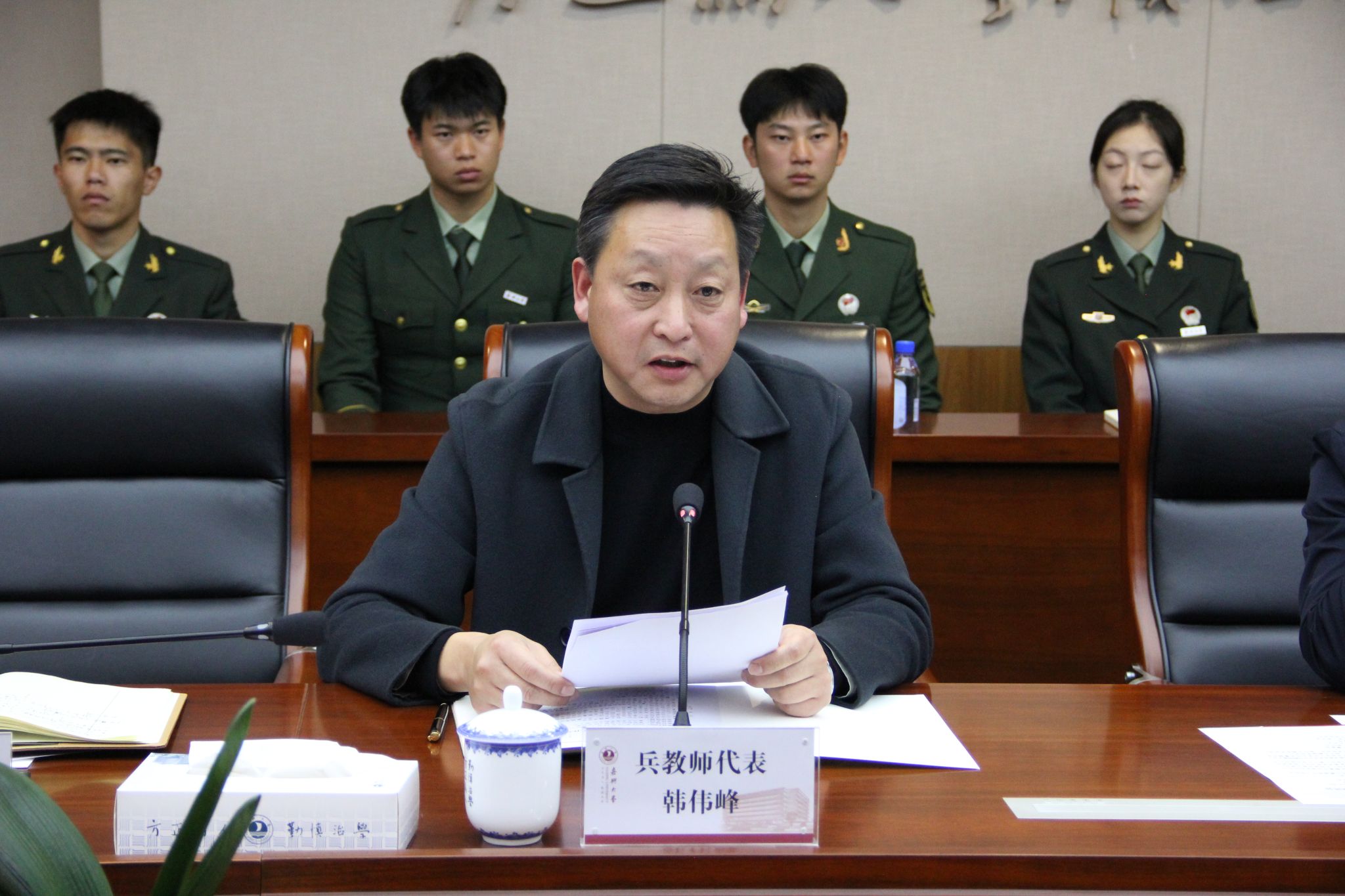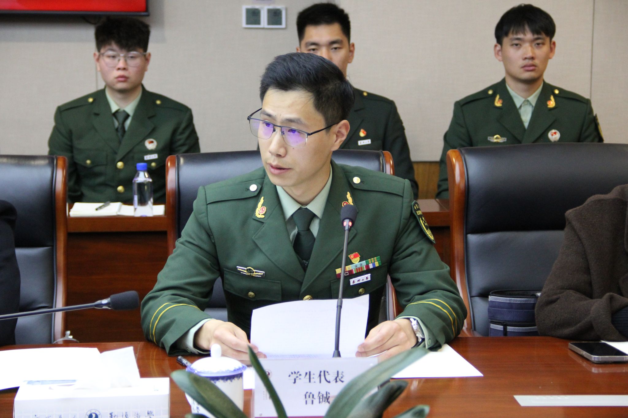 体育教育师范专业退役士兵学生代表鲁铖发言,表示未来将努力成为学生品格锤炼、知识学习、体魄强健、信念塑造的引路人。