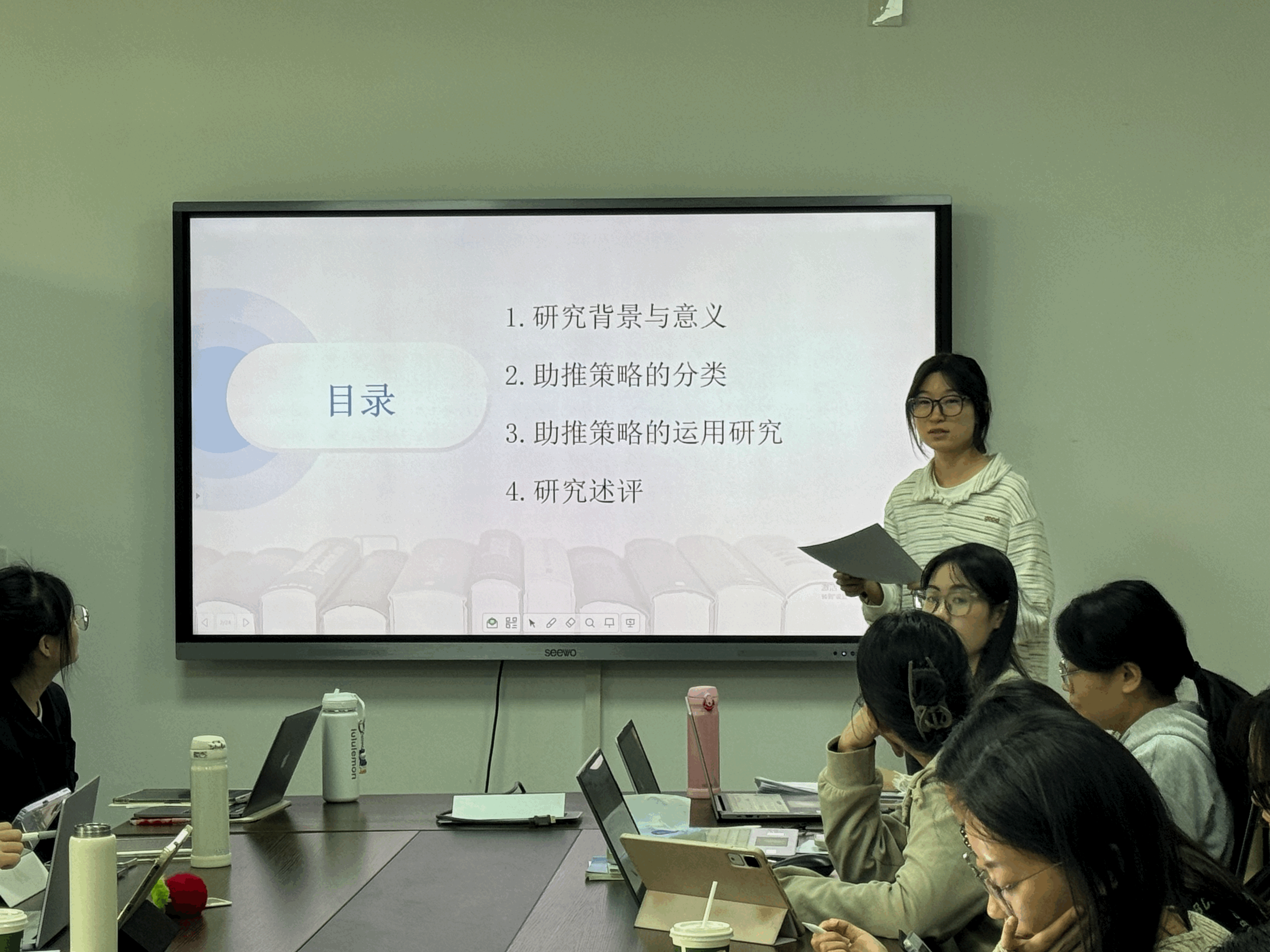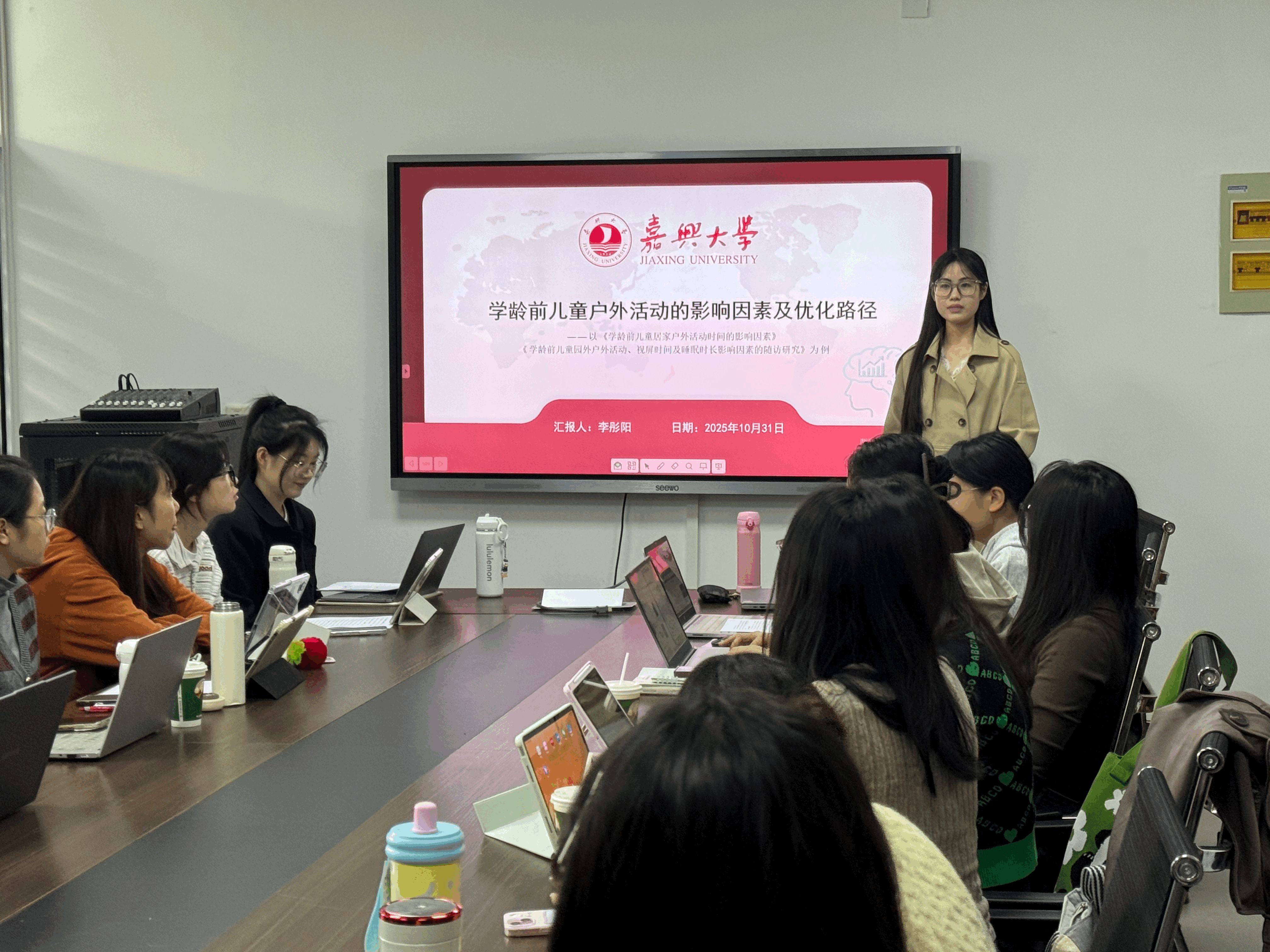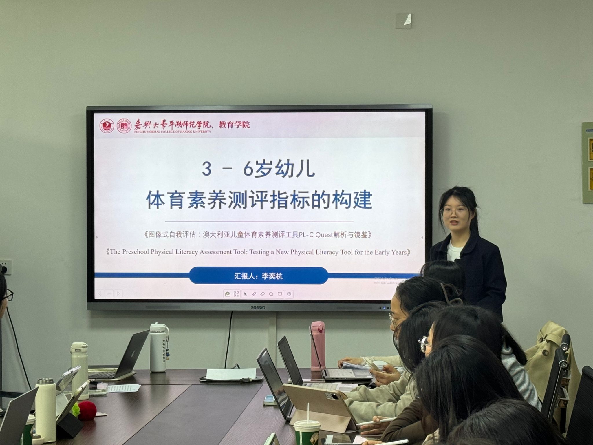 李彤阳同学以《学龄前儿童户外活动的影响因素及优化路径》为题,基于实证研究指出当前儿童肥胖与近视问题突出,而户外活动明显不足,因素主要包括家庭照护者行为、物理环境、幼儿自身特征及健康行为间的相互作用;董婧妮同学以《融合教育背景下小班自闭症幼儿“随班就读”实践困境与对策研究》为题,从理念兴起、政策四阶段演进,到幼儿、教师、家长、制度四维困境的纵向对比,揭示专业话语更新、教师压力显性、家长认知偏差、制度缺评价追踪;李奕杭同学专注于3-6岁幼儿体育素养测评指标的构建,通过解析两篇文献,并对两篇文献中采用的测量方式进行对比,系统梳理了国际上前沿的儿童体育素养测评理念与方法;杨帅迪同学系统梳理“助推策略在儿童青少年运动与健康领域的应用研究进展”,提出传统健康教育模式难以实现持久行为改变,而源自行为经济学的助推理论通过优化“选择架构”,以低成本、易操作的方式引导健康行为。陆浩博士针对专业文献的阅读、核心概念的界定、研究评述的架构以及研究理论到实践的开展等方面进行了指导,帮助研究生更好地学习学术论文的阅读、分析和撰写。