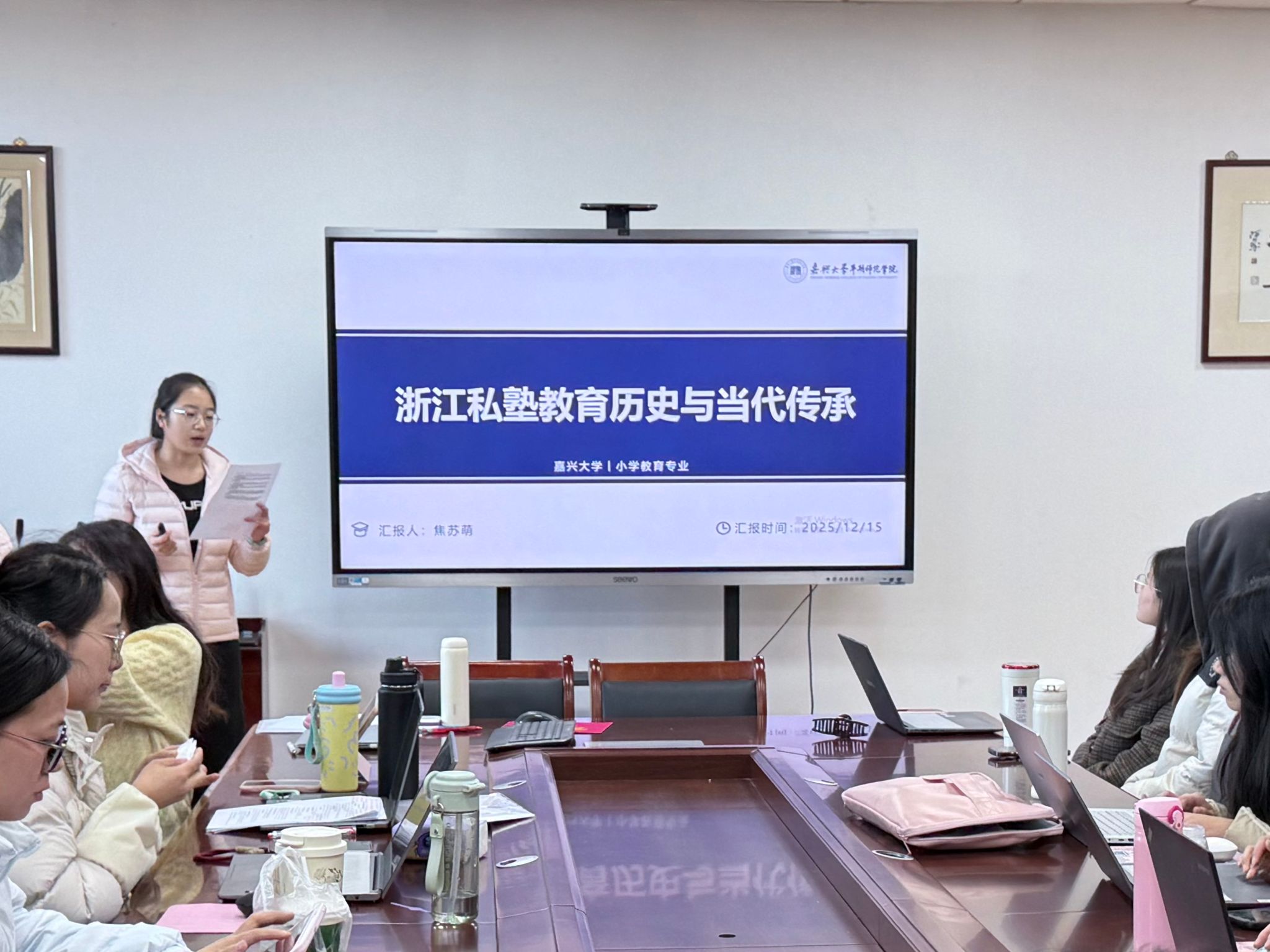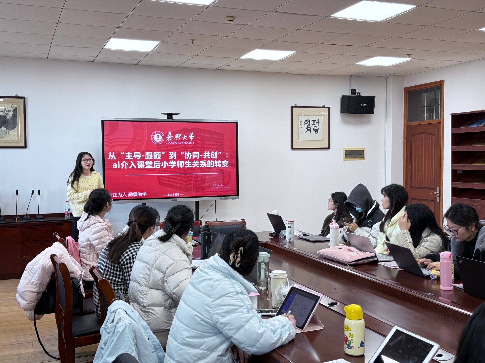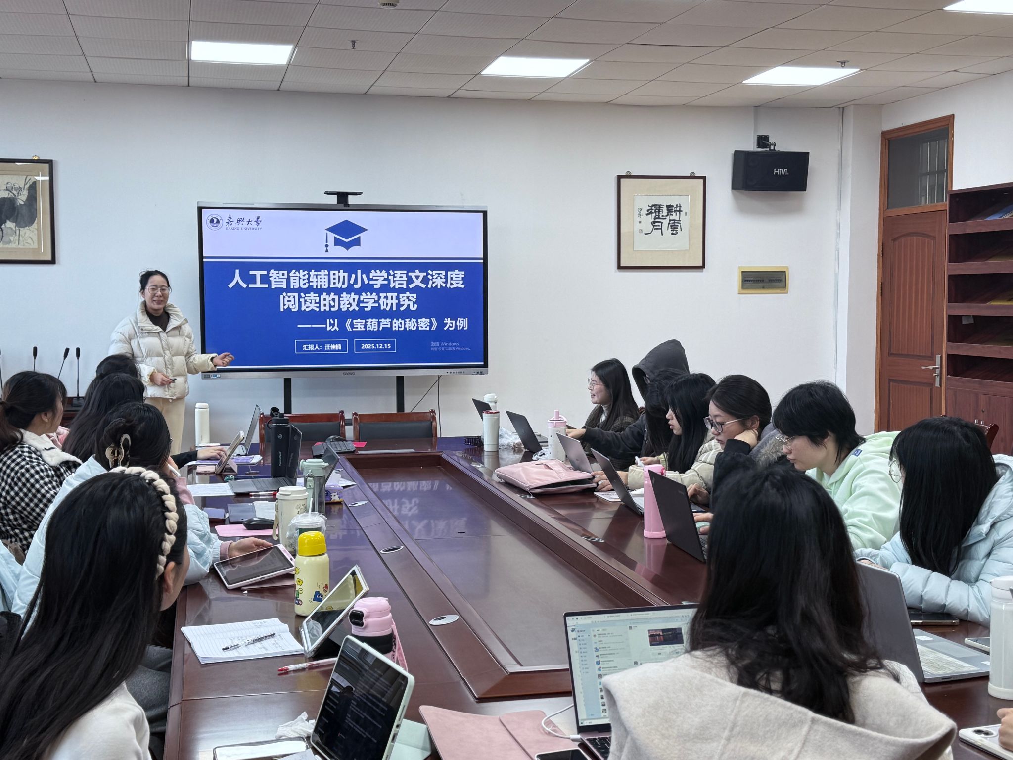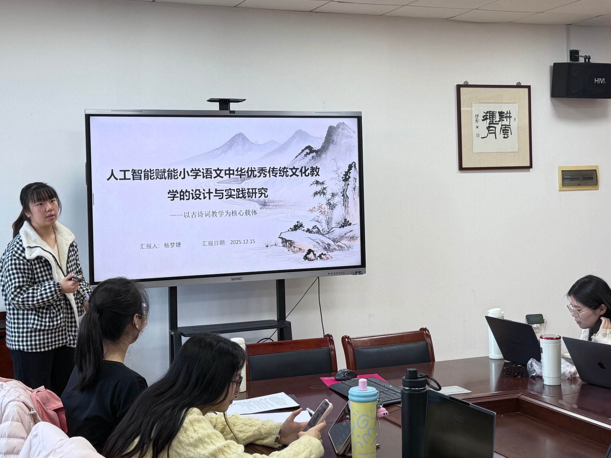 焦苏萌同学以《浙江私塾教育历史与当代传承》为题,立足浙江地域文化特色,梳理宋元至当代的私塾教育发展脉络,为传统文化活态传承提供有益参考。汪佳楠同学以《人工智能辅助下的小学语文深度阅读教学的实践研究》为题,以《宝葫芦的秘密》为案例,探究人工智能在教学各环节的应用路径。丁珂楠围绕《从“主导—跟随”到“协同—共创”:AI介入小学课堂后师生关系的转变》,从技术变革、政策导向等维度切入,探讨师生关系转型路径。杨梦婕以《人工智能赋能小学语文中华优秀传统文化教学的设计与实践研究》为题,针对古诗词教学困境,期望构建AI融合教学模型。刘雨杭博士对四位汇报人的研究成果给予高度肯定,认为选题兼具理论价值与实践意义。同时,她从研究方法优化、研究范围聚焦等方面提出针对性建议,引导同学们在互动交流中拓宽视野、深化思考。