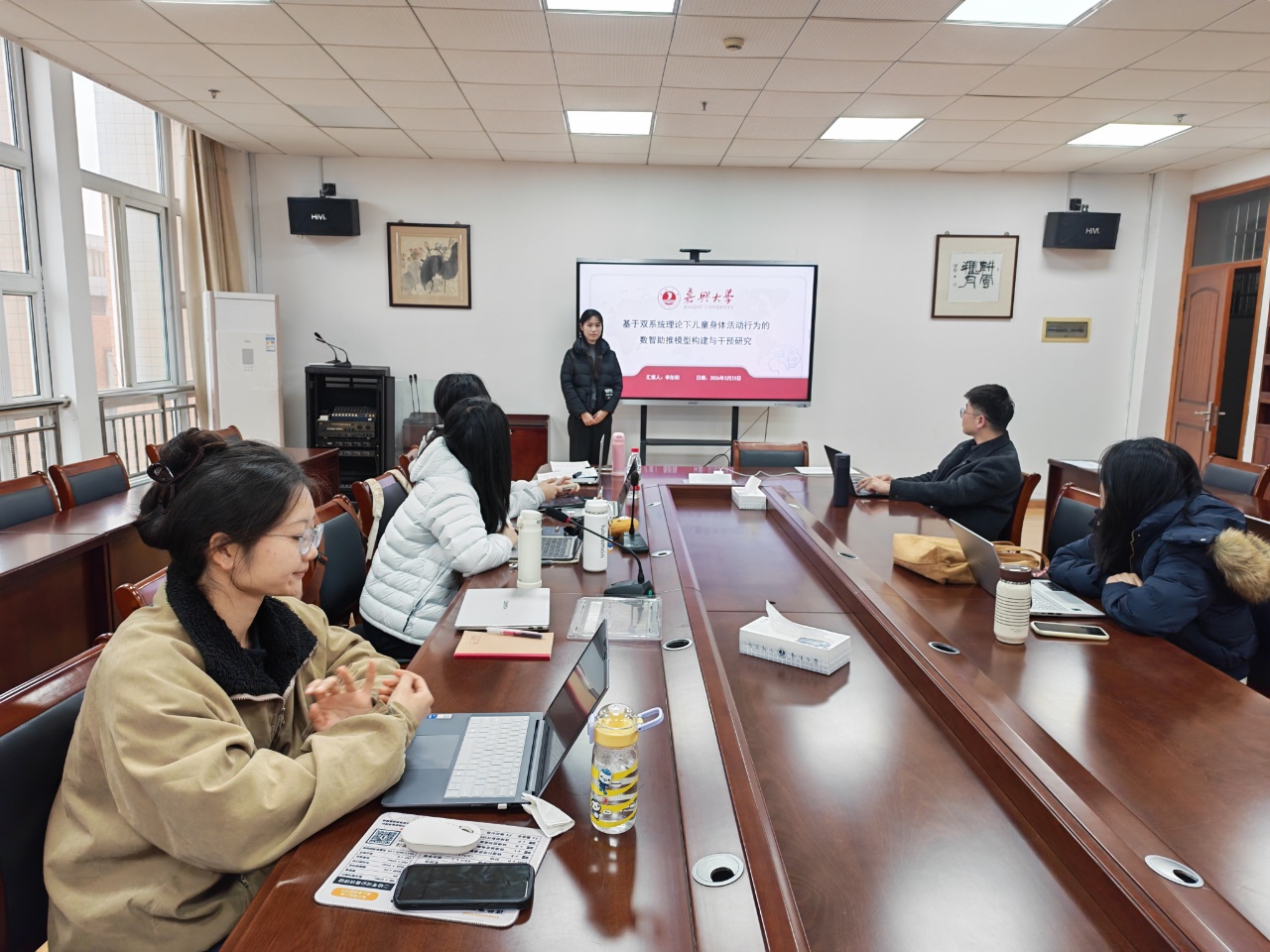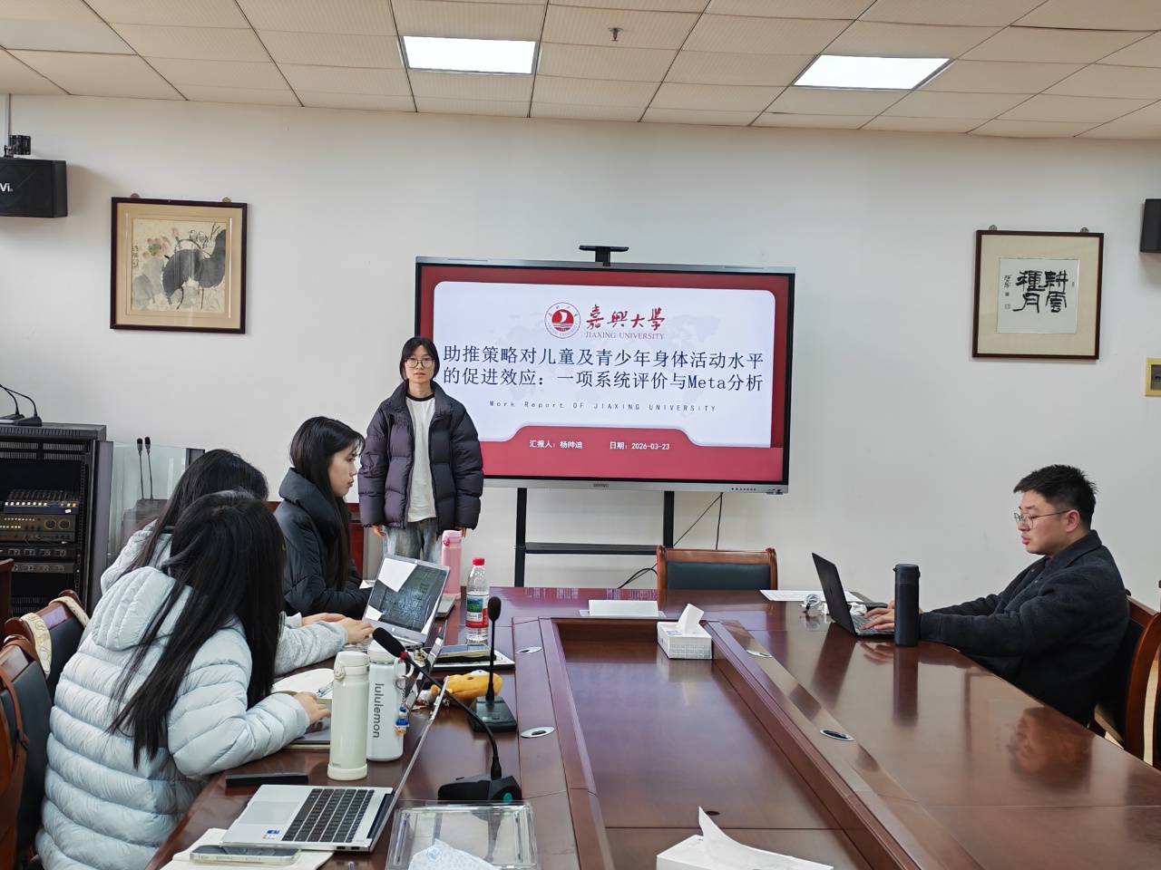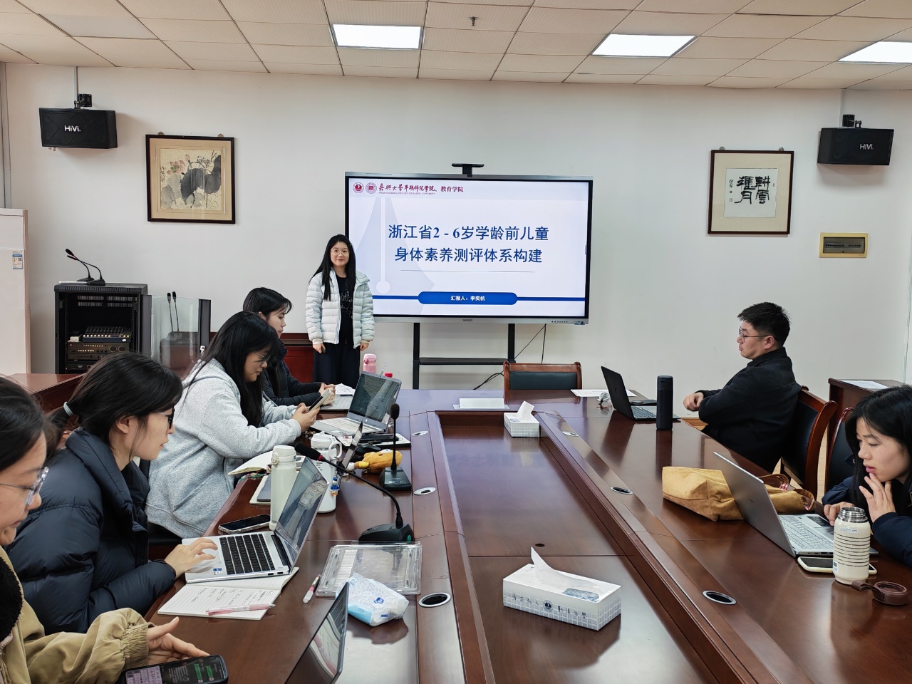 汇报环节中,李彤阳、李奕杭、董婧妮、杨帅迪四位同学结合自身研究方向,分享了研究进展、成果与思考,内容兼具理论深度与实践价值。李彤阳以《基于双系统理论下儿童身体活动行为的数智助推模型构建与干预研究》为题,研究儿童超重肥胖、户外活动不足等的现实问题。李奕杭作《浙江省2-6岁学龄前儿童身体素养测评体系构建》汇报,详细介绍了通过德尔菲法、序关系分析法构建指标体系、完成初步构权的过程,以及各领域测评工具的开发与预实验情况。董婧妮围绕《教师实施同伴支持策略促进特需幼儿互动的相关研究》,系统梳理2019至2025年间融合教育领域相关实证研究。杨帅迪以《助推策略对儿童青少年身体活动水平的促进效应:一项系统评价与Meta分析》为题,采用系统评价与Meta分析方法,整合多数据库相关研究,证实助推策略对提升儿童青少年身体活动水平的显著效果。学术指导环节,陆浩博士对四位研究生的研究汇报进行逐一点评,充分肯定了各研究的选题价值与研究思路,同时结合研究内容提出针对性的优化建议。