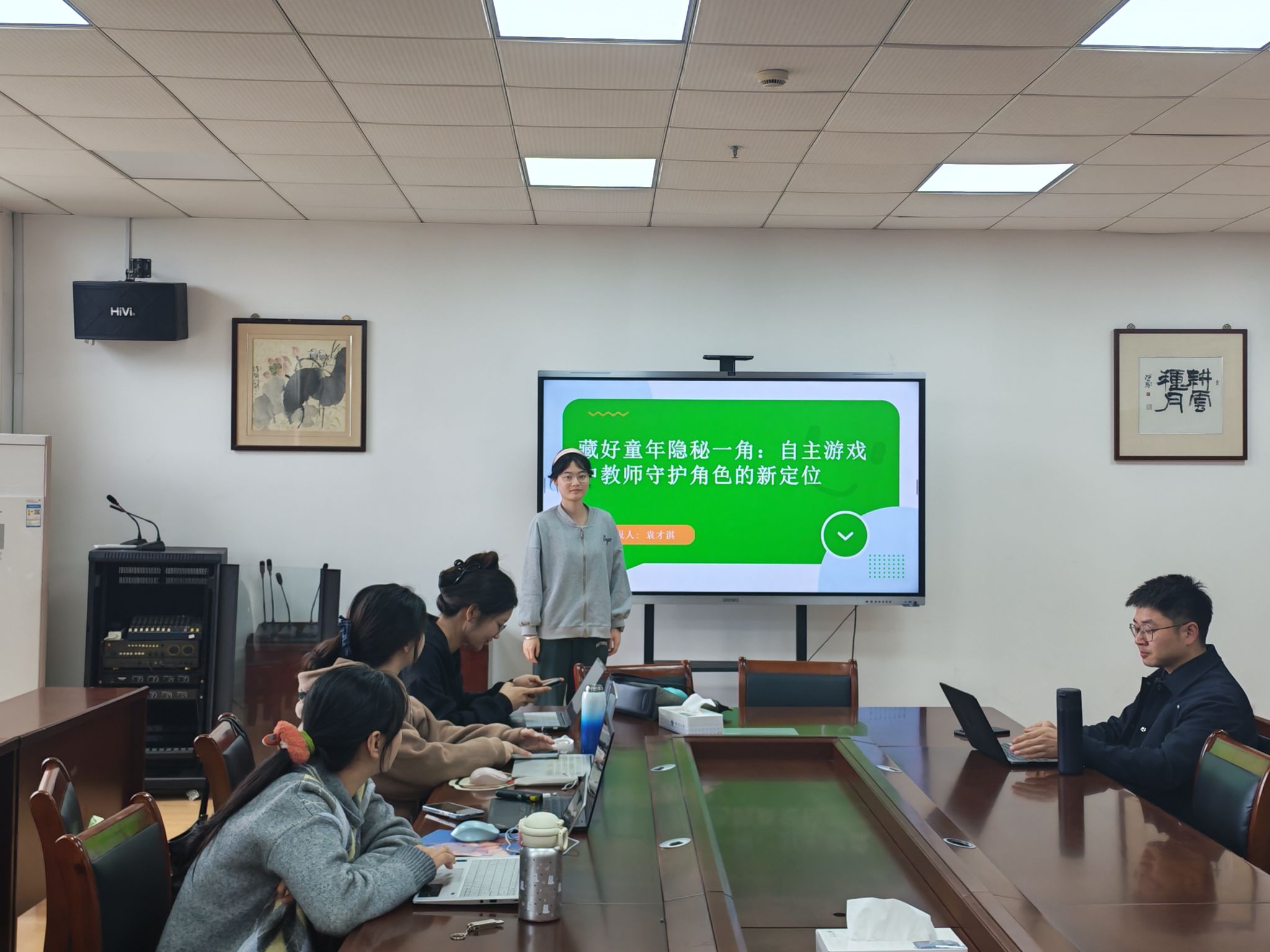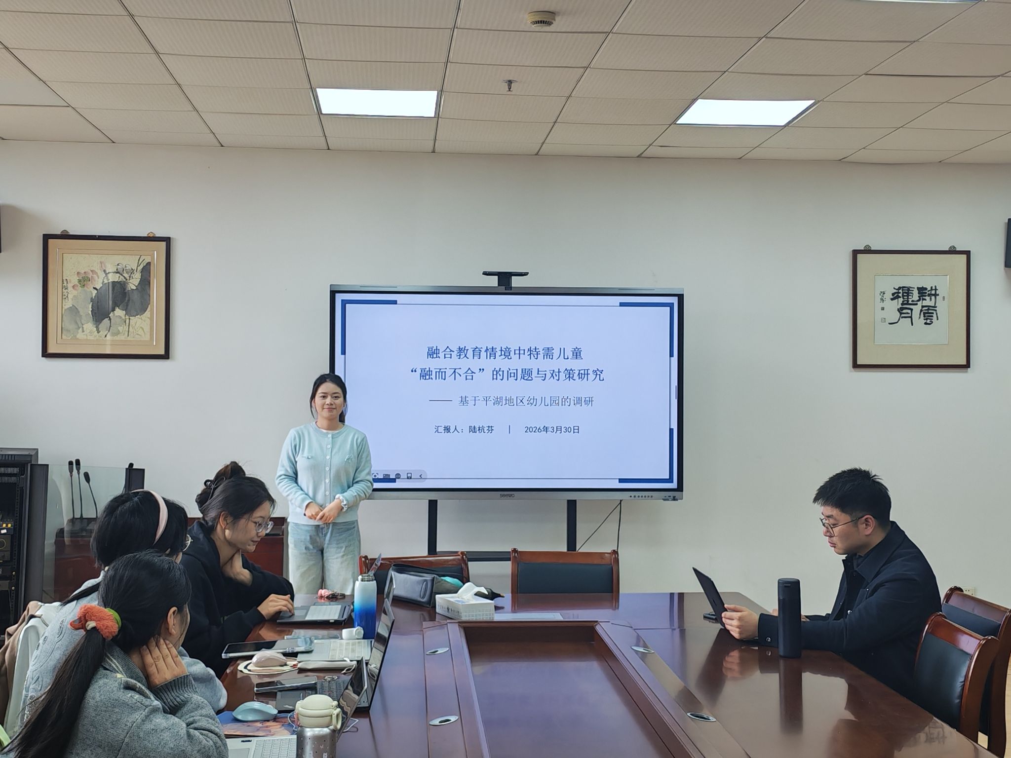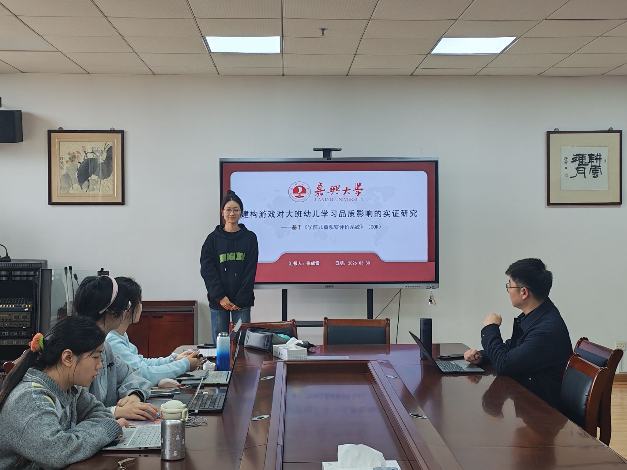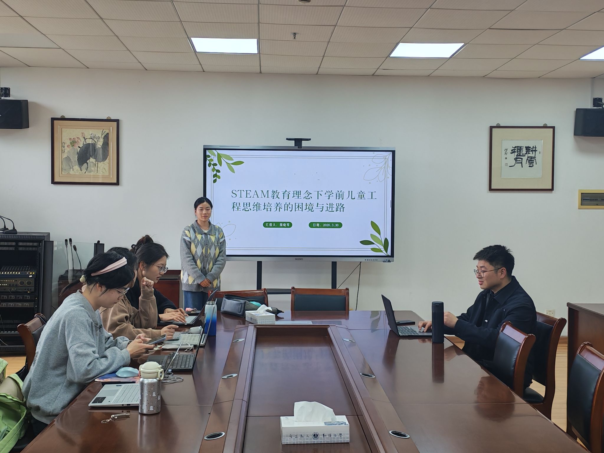 汇报环节中,张成雪、袁才淇、颜晓琴、陆杭芬四位同学结合各自研究方向,分享了研究进展与思考,内容兼具理论深度与实践价值。张成雪作《建构游戏对大班幼儿学习品质影响的实证研究——基于〈学前儿童观察评价系统〉(COR)》汇报,探究递进式建构游戏对幼儿学习品质的干预效果。袁才淇以《藏好童年隐秘一角:自主游戏中教师守护角色的新定位》为题,探讨自主游戏中儿童秘密权益面临的现实困境。颜晓琴以《STEAM教育理念下学前儿童工程思维培养的困境与进路》为题,探讨学前儿童工程思维的启蒙与培养路径。陆杭芬作《融合教育情境中特需儿童“融而不合”的问题与对策研究——基于平湖地区幼儿园的调研》汇报,聚焦学前融合教育中“有参与但未干扰活动”型特需儿童的隐性困境。学术指导环节,陆浩博士对四位研究生的研究汇报进行逐一点评,充分肯定各研究的选题价值与思路,同时结合研究内容提出针对性的优化建议,助力研究生进一步完善研究设计、夯实理论基础、规范研究方法。