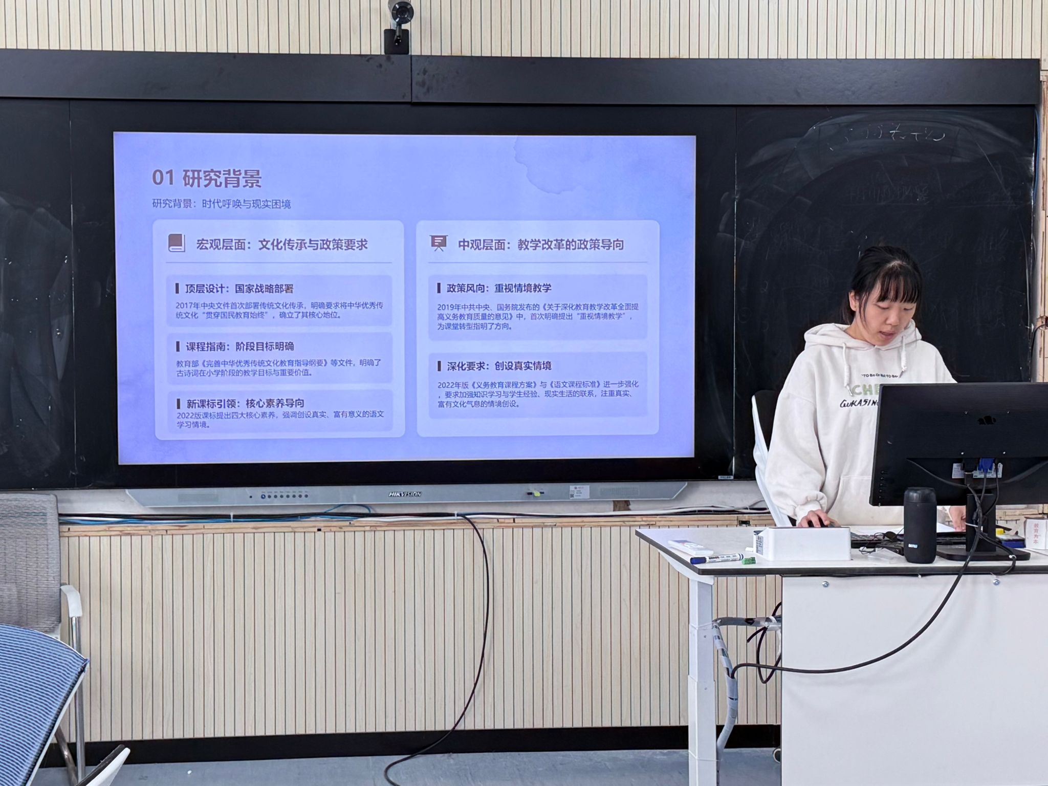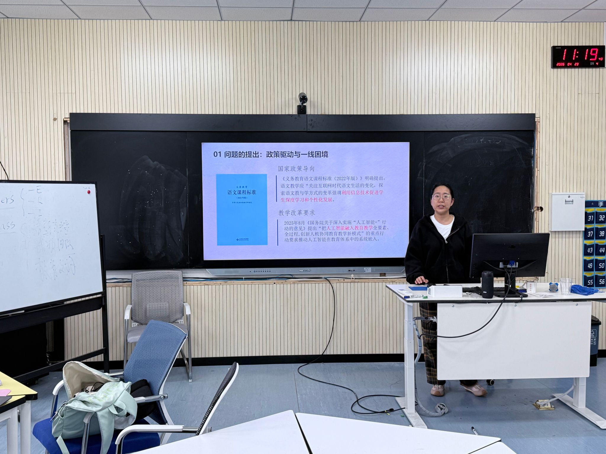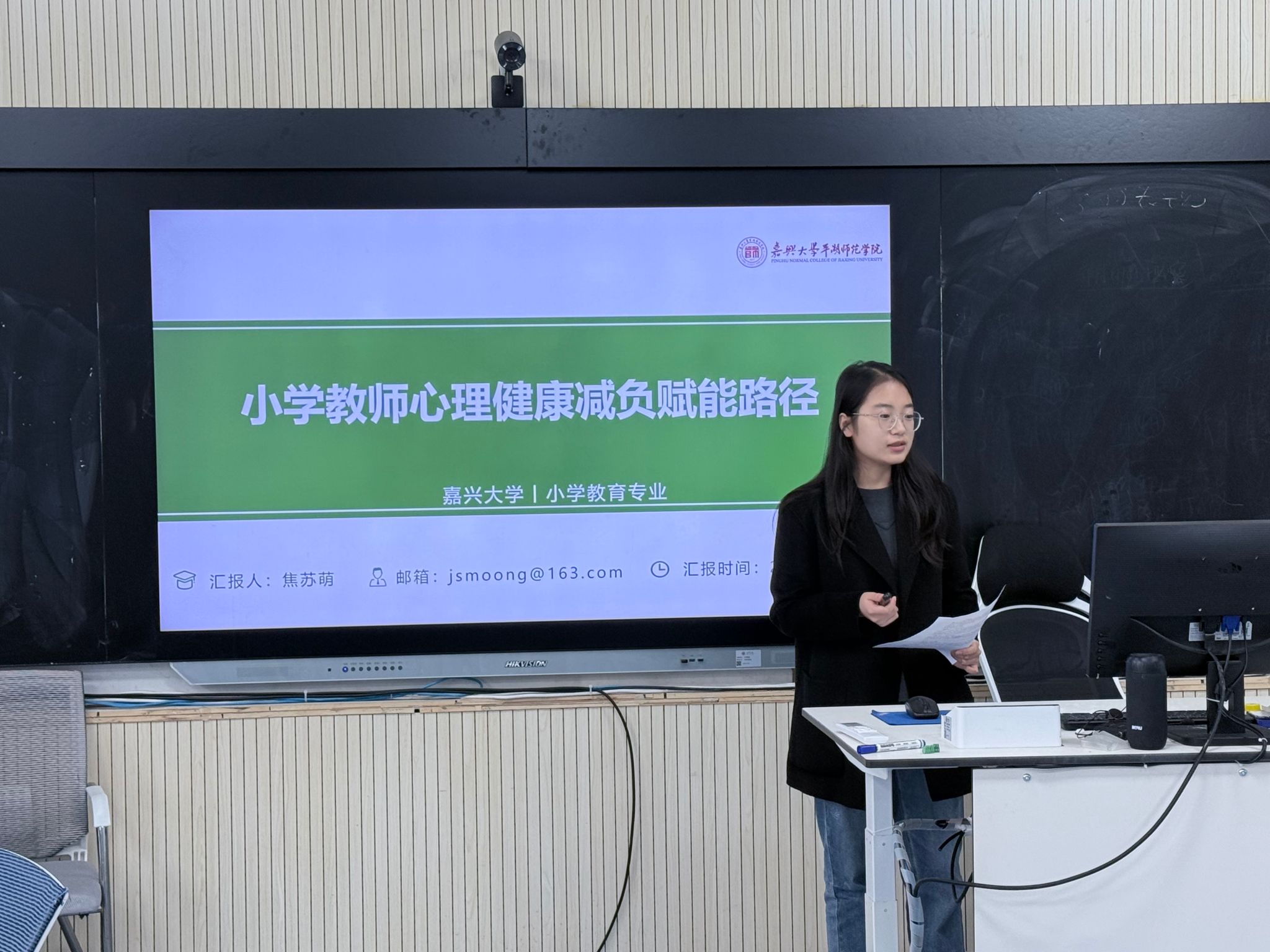 汇报环节中,四位研究生立足自身研究领域,分享研究进展、核心发现与实践思考,内容兼具理论性与实践性。焦苏萌以《小学教师心理健康减负赋能路径》为题,旨在构建“政策—学校 —个体”三位一体减负赋能路径。丁珂楠围绕《日本小学地域文化教育实践及其对中国STEM课程建设的启示》,为我国STEM课程本土化、文化与技术融合提供实践参考。汪佳楠作《AI辅助一节课到底有多难?——以〈宝葫芦的秘密〉教学迭代为线索的叙事研究》汇报,为智能技术与小学语文教学深度融合提供实践参照。杨梦婕以《情境教学法在小学古诗词教学中的应用策略研究》为题,旨在为一线教学提供可操作方案,助力落实文化自信与审美素养培育。学术指导环节,景慧博士对四份汇报逐一细致点评,充分肯定选题价值与研究思路,并针对论文框架、研究方法、逻辑梳理、实践落地等提出精准优化建议。